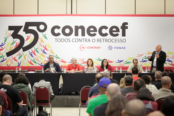 Os ataques ao sistema de previdência complementar de entidades fechadas e ao sistema de saúde dos trabalhadores foram os primeiros temas debatidos no 35º Congresso Nacional dos Empregados da Caixa Econômica Federal (Conecef), que teve início, nesta quinta-feira (1), em São Paulo, com a participação de 328 delegados e delegadas de todo o país. O primeiro painel Saúde e Previdência “Não ao Retrocesso” teve como debatedores os assessores da Fenae, Albucacis de Casto Pereira e Paulo Borges e a vereadora Juliana Cardoso (PT/SP).