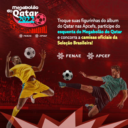 Há e tem mais: os sócios empregados Caixa ativos, aposentados e pensionistas, que se inscreverem no link: www.fenae.org.br/megabolaoqatar e ativarem o cadastro na plataforma do Bolão www.fenae.org.br/bolao, irão concorrer a 10 camisas oficiais da Seleção Brasileira.  Disponibilizaremos um computador e as inscrições vão até o dia 15 de novembro.