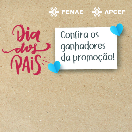 Saiu o resultado da campanha “Dia dos Pais” da Fenae (Federação Nacional das Associações do Pessoal da Caixa Econômica Federal). Os ganhadores foram: Jacson Cruz do Nascimento (Apcef/DF), Adeilson Costa Gois (Apcef/SE), Washington Tadeu Scancari (Apcef/SP), Bruno dos Santos Alpino (Apcef/RJ), Tiago Francisco Laurindo do Nascimento (Apcef/PE), Leandro Barp (Apcef/RS), Rosalvo Aparecido dos Santos (Apcef/PR) e Fabricio Elisio Tiago Soares, este último, sócio da (Apcef/MG).