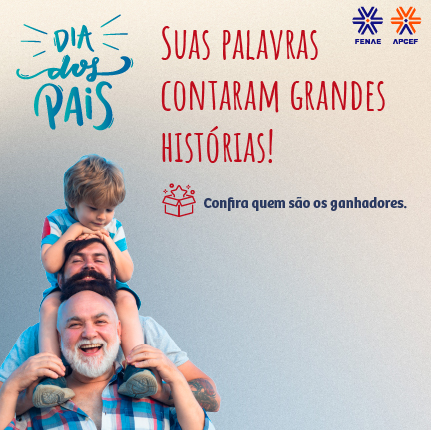 Foi divulgado o resultado do concurso cultural “Suas palavras contam grandes histórias!”, iniciativa da Federação Nacional das Associações do Pessoal da Caixa (Fenae) e das Apcefs em homenagem ao Dia dos Pais.  “Geraldo Afrânio Silva, da Apcef/MG, Luiz Fernando Cheres, da Apcef/PR e Carlos Augusto Bohana Filho, da Apfeg/SE são os vencedores da promoção dedicada aos genitores, e vão levar para casa, cada um deles, um voucher no valor de R$ 350.