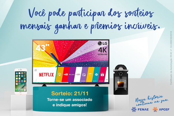 A campanha de associação da Fenae e das Apcefs “Nossa história continua na sua” continua mostrando o trabalho das duas entidades e distribuindo prêmios. O sorteio realizado no último sábado (22), pela Loteria Federal, garantiu iPhones 7, Smart TVs LG 43” e cafeteiras Nespresso para os que se associaram por meio da plataforma e para os que indicaram amigos que efetivarem a associação a uma das 27 Apcefs do país.
