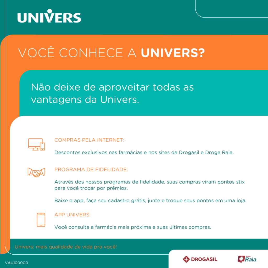 Além disso, existem as vantagens da Univers, um programa com descontos especiais para quem possui benefício de empresa, plano de saúde ou outras parcerias. Confira: