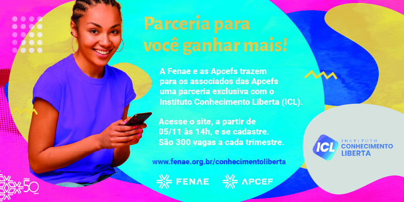 A Federação Nacional das Associações do Pessoal da Caixa Econômica Federal (Fenae), junto com as Associações do Pessoal da Caixa (Apcefs), fizeram uma parceria exclusiva com o Instituto Conhecimento Liberta (ICL). A novidade oferece aos empregados Caixa, associados a uma das 27 Apcefs, 300 vagas para acessar mais de 70 cursos on-line e aprender novas habilidades como história da arte, bem-estar social, teoria musical, financias e investimentos e muito mais. As inscrições começam nesta sexta-feira, (05/11).