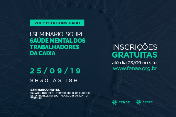 A Fenae promove em 25 de setembro o I Seminário sobre Saúde Mental dos empregados da Caixa. Com o tema “Não Sofra Sozinho”, o evento em Brasília vai debater sobre saúde do trabalhador, assédio moral e suicídio na categoria bancária.