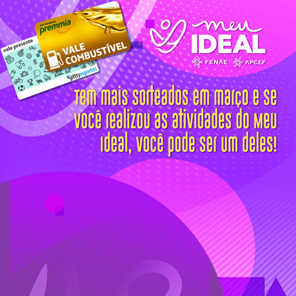 Ao participarem em março dos desafios do programa Meu Ideal, os empregados Atene de Fátima Fraga Vitalino, associada à Apcef/MG, e Antônio Reginaldo Vasconcelos, vinculado à Apcef/MS, são os sorteados da vez. Ambos ganharam R$ 500 em vale combustível (marca Premmia) e um voucher da marca Gift, do segmento esportes, respectivamente.