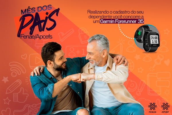 Durante o mês dos pais os empregados Caixa do sexo masculino, ativos ou aposentados associados às Apcefs que cadastrarem seus filhos e/ou enteado ou netos como dependentes na Plataforma de Associação (www.fenae.org.br/associacao) poderão ser premiados com um dos melhores relógios esportivos do mercado, o monitor cardíaco Garmin Forerunner 35.