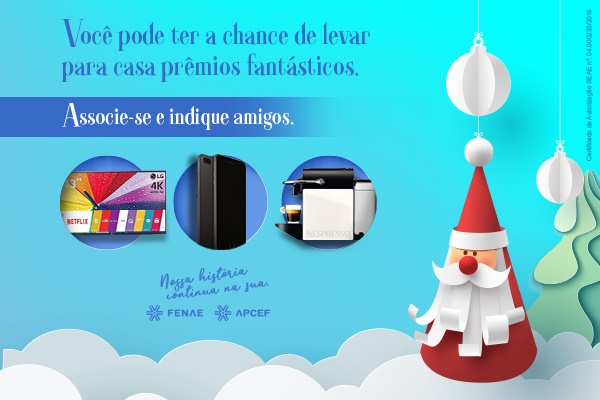 Será no dia 22 de dezembro, pela Loteria Federal, o próximo sorteio da campanha de associação da Fenae e das Apcefs “Nossa história continua na sua”. Os que se associaram por meio da plataforma e vão concorrer a um iPhone 7, uma Smart TV LG 43” e cinco cafeteiras Nespresso. Os já associados que indicaram amigos que efetivarem a associação concorrerão aos mesmos prêmios.