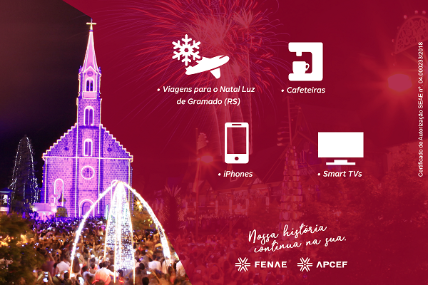 Será realizado neste sábado (20), pela Loteria Federal, mais um sorteio da campanha de associação da Fenae e das Apcefs “Nossa história continua na sua”. Estão concorrendo os novos associados a uma das 27 associações e quem indicou amigos que efetivaram a associação. Os prêmios principais deste mês serão viagens com acompanhante para o Natal Luz de Gramado (RS). Também serão sorteados iPhones 7, Smart TVs 43’’ e cafeteiras.