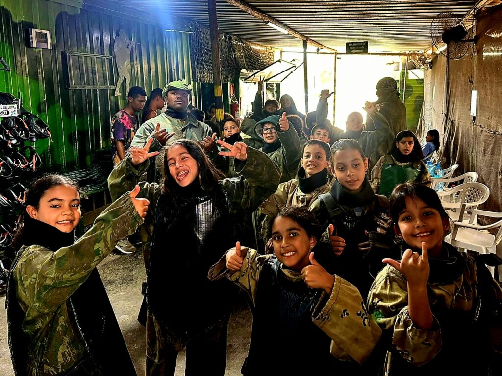 🔫 Paintball – A brincadeira ganhou clima de missão secreta! Em segurança e com equipamentos adaptados, a garotada se dividiu em equipes e entrou em ação com estratégia e espírito de equipe.