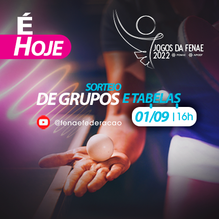Nesta quinta-feira (1), os atletas e equipes técnicas vão conhecer os confrontos da fase final dos Jogos da Fenae 2022. O sorteio dos grupos e tabelas acontece a partir das 16h e será transmitido ao vivo no canal da Fenae no Youtube. Acompanhe!