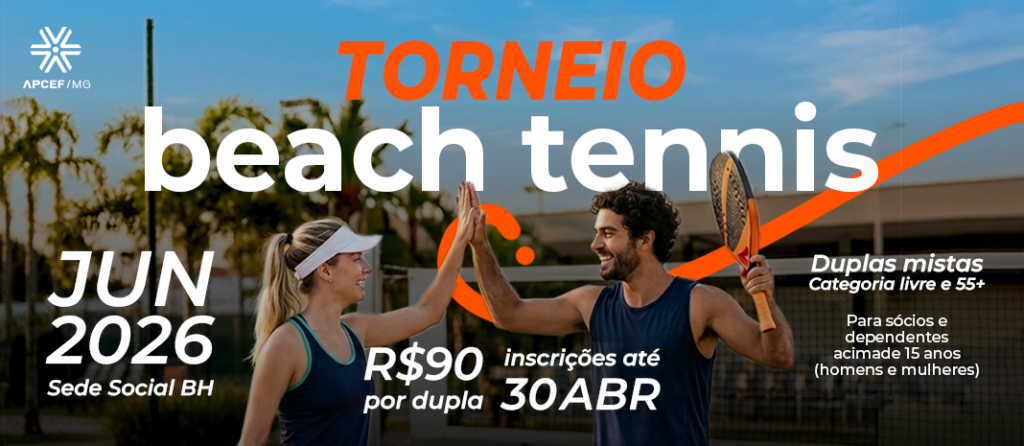 A APCEF/MG está com inscrições abertas para o Torneio de Beach Tennis 2026, que será realizado em junho nas quadras de areia da Sede Social BH. Podem participar somente sócios e dependentes, homens e mulheres, com idade mínima de 15 anos.