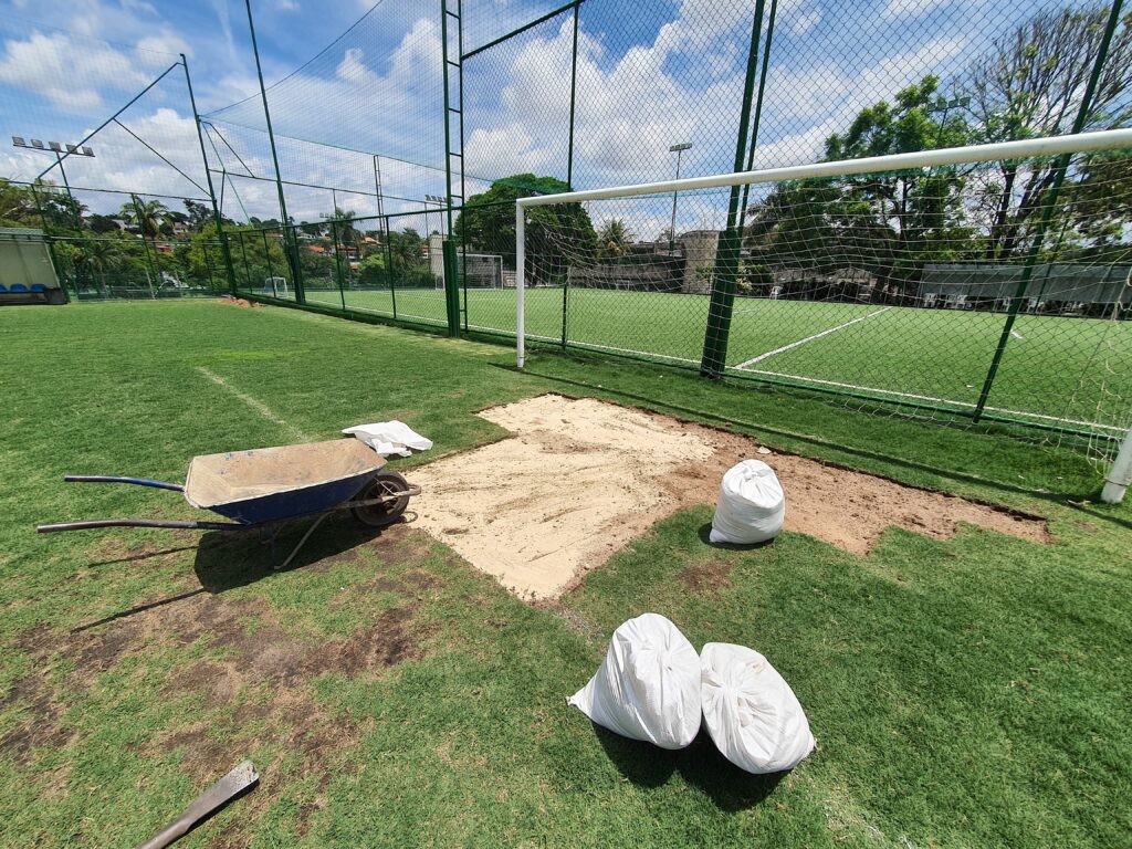 Também está sendo feito o nivelamento superficial com areia, o reforço da adubação orgânica em subsuperfície com o Terral Green, que aprofunda no solo e melhora sua estrutura, e a aplicação de areia em pontos específicos para o nivelamento fino. Por fim, todo o campo está recebendo a distribuição do Terral Green utilizando um rolo para garantir um acabamento uniforme.