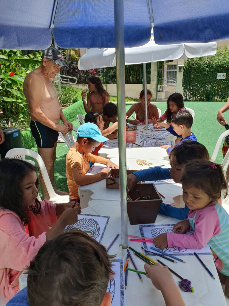 No gramado artificial, as crianças puderam colorir imagens de máscaras que fazem parte da história e ancestralidade da cultura negra. No mural pendurado na entrada do parquinho infantil, os desenhos produzidos se misturavam com informativos sobre culinária, danças e instrumentos musicais criados no passado pela comunidade quilombola.