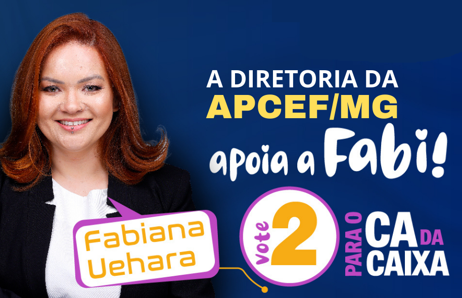 A Diretoria Executiva da APCEF/MG declara o seu apoio à candidatura de Fabiana Uehara Prosholdt (0002) na eleição para representante dos empregados no Conselho de Administração (CA) da Caixa, que será realizada de 26 a 29 de fevereiro de 2024.