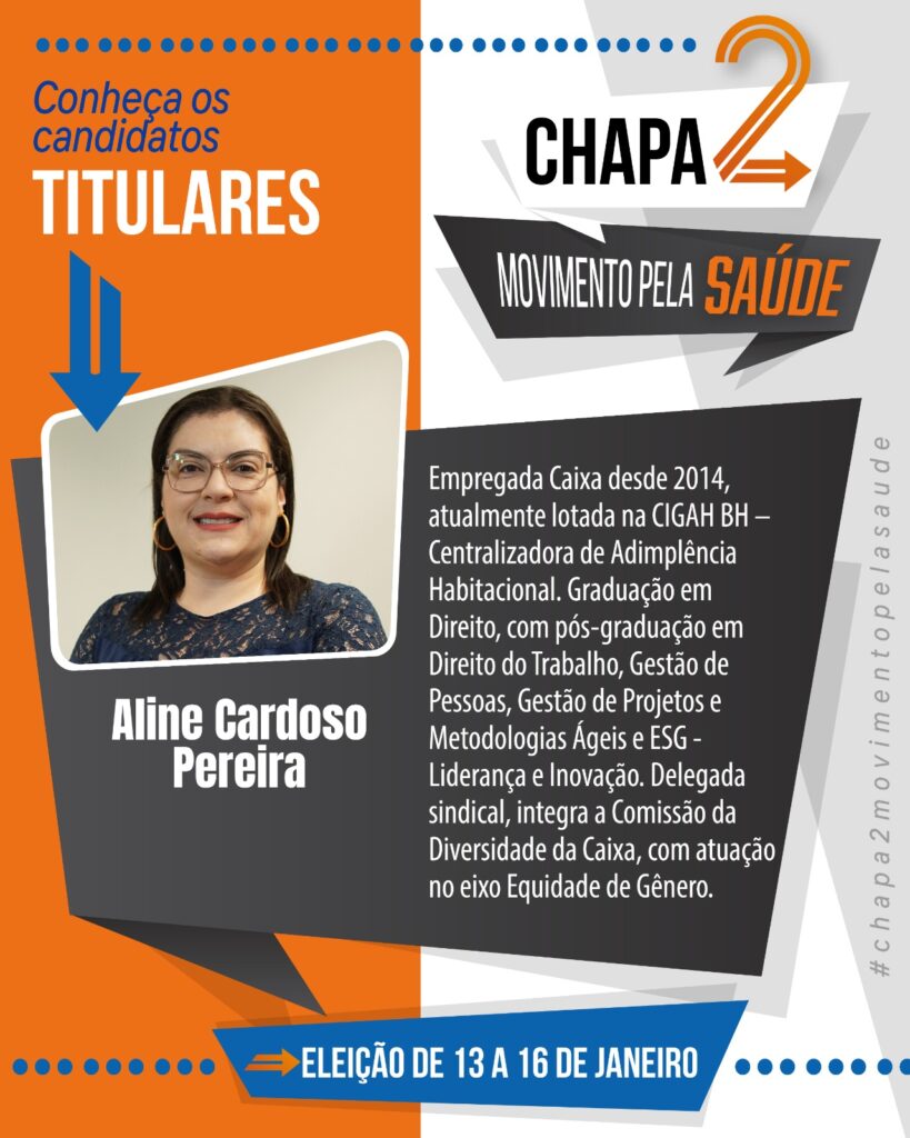 Dentre os integrantes titulares da CHAPA 2 está a nossa colega Aline Cardoso Pereira, atualmente lotada na CIGAH BH (Centralizadora de Adimplência Habitacional). Delegada sindical, Aline integra a Comissão da Diversidade da Caixa, com atuação no eixo equidade de gênero.