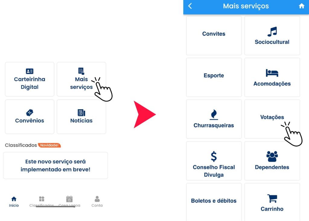 A votação também estará disponível no aplicativo oficial da APCEF/MG, disponível para Android e iOS (buscar por APCEF/MG nas lojas). Após baixar o App, basta acessar com a mesma senha que você definiu na área do usuário. E para votar, clique no botão MAIS SERVIÇOS na tela inicial, e depois em VOTAÇÕES: