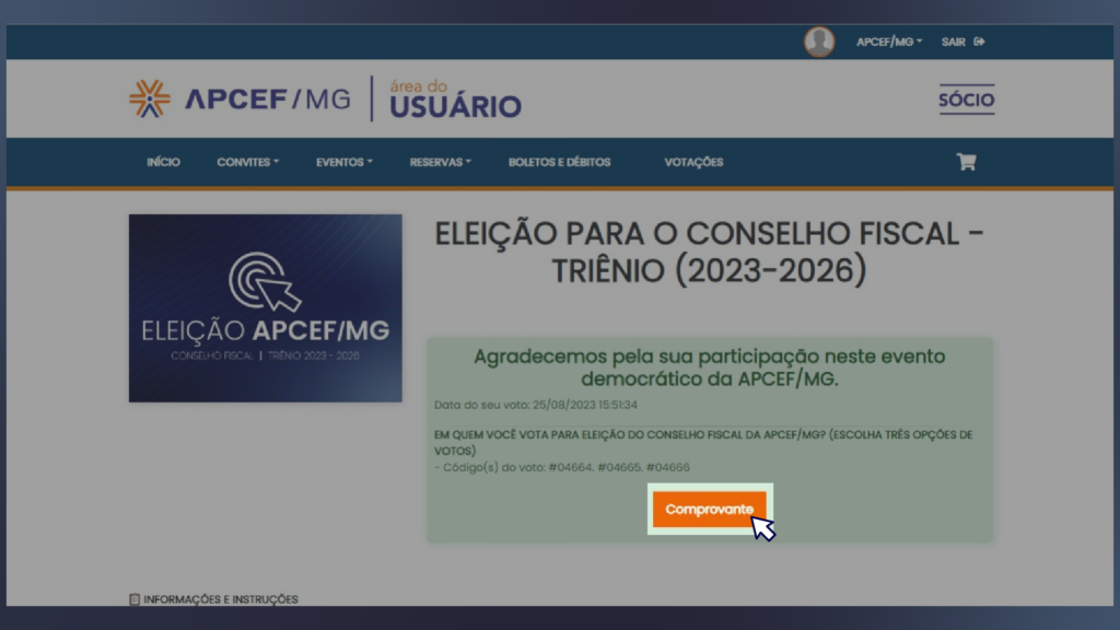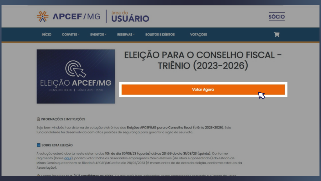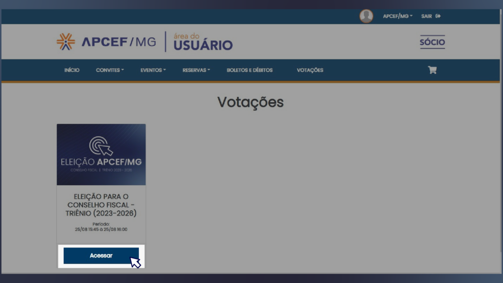 2- Ao acessar o sitema, vá em “Votações” e depois clique “Acessar”, no banner da Eleição para o Conselho Fiscal – triênio (2023-2026)