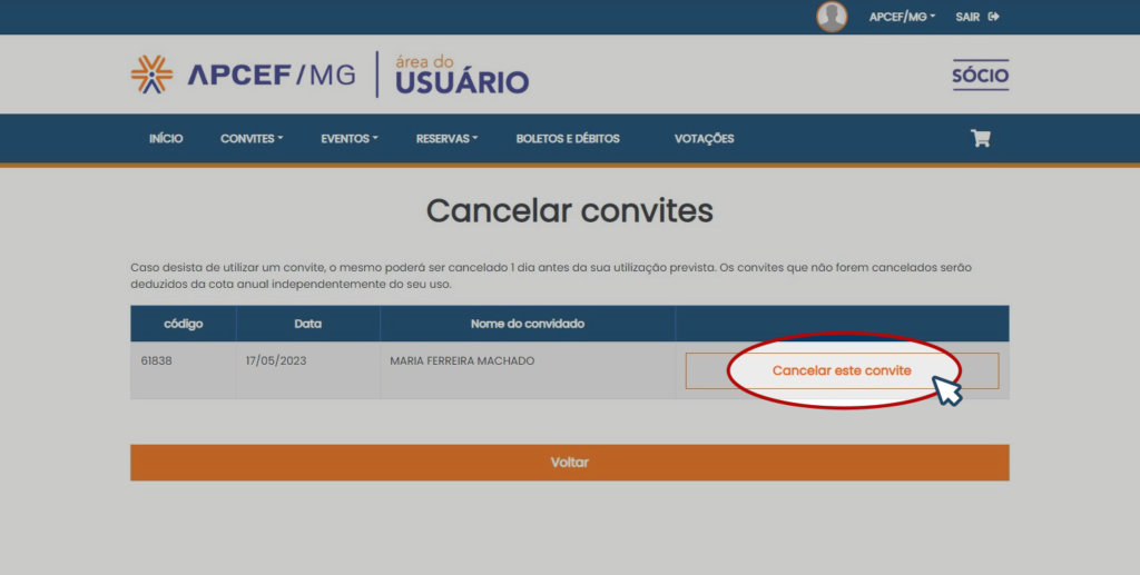 🔸 Uma vez cancelado, o convite ficará indisponível para utilização, sendo o associado penalizado, caso um convidado tente acessar o clube com o mesmo.