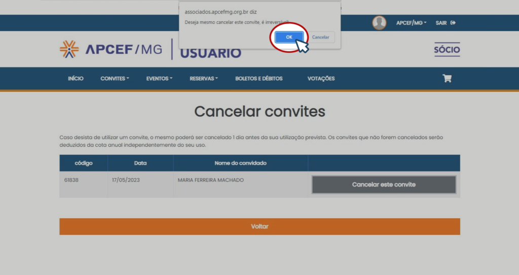 Passo 03: agora é a hora de finalizar o processo, confira atentamente os dados do convidado que deseja cancelar o convite e clique em ok. Após isto, o procedimento não poderá ser desfeito.