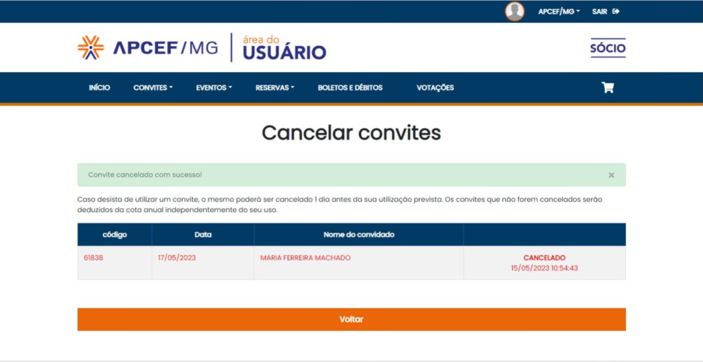 🔸 Os convites cancelados, retornam ao sistema e ficarão disponíveis para retirada, pelos demais associados;