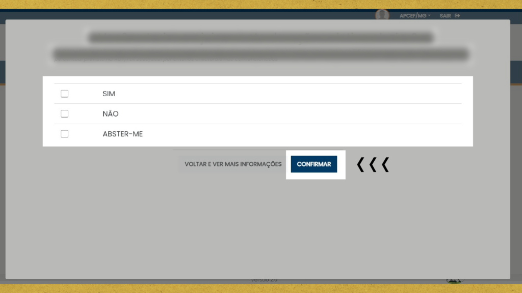 ✅ PASSO 3: A partir de agora você votará em uma pauta por vez, podendo optar pelas respostas SIM, NÃO ou ABSTER-ME. Ao selecionar a opção do seu voto, clique em CONFIRMAR. Neste momento, um alerta de confirmação do voto aparecerá. Atenção: caso confirme, não será mais possível votar novamente nesta pauta. O mesmo ocorrerá nas pautas seguintes: