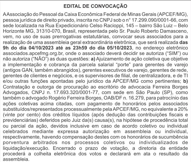 Começou mais uma Assembleia Geral Extraordinária eletrônica da APCEF/MG. Empregados Caixa, da ativa ou aposentados, podem votar pelá área do usuário (menu VOTAÇÕES), desde as 9h de HOJE, 04/10/23 (quarta-feira), até as 23h59 do dia 05/10/23 (quinta-feira). Os sócios participantes decidirão se autorizam ou não as duas pautas: