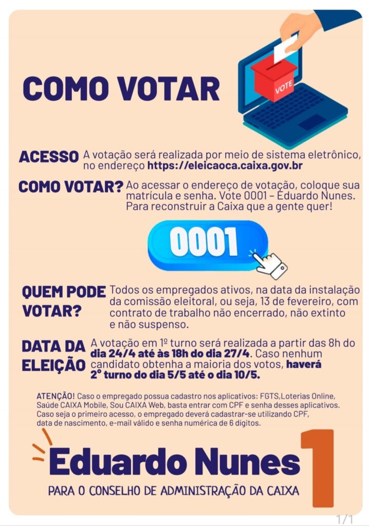 Foi aberta hoje (24/04), e vai até 27 de abril, a votação das eleições para o Conselho de Administração (CA) da Caixa Econômica Federal. A Diretoria Executiva da APCEF/MG APOIA o candidato EDUARDO NUNES (0001), que busca o resgate do orgulho de ser Caixa e exerceu forte atuação em defesa dos empregados ao longo dos últimos anos.