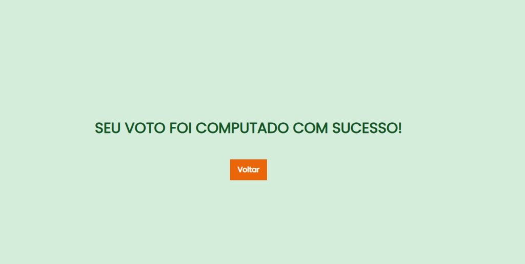 ✅ 5º PASSO: Após confirmar o seu voto, você verá esta tela verde com uma mensagem de sucesso. Clique no botão VOLTAR.