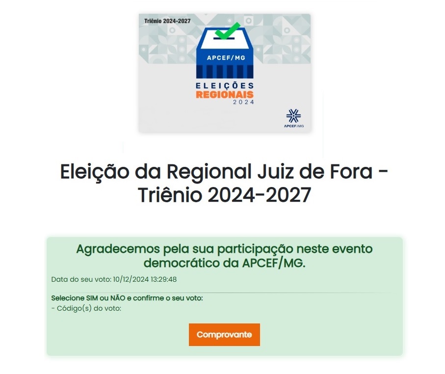 ✅ ÚLTIMO PASSO: Pronto! Você contribuiu para mais um processo democrático da APCEF/MG. Um comprovante de votação poderá ser baixado ao clicar no botão COMPROVANTE, disponível na tela inicial do sistema desta eleição.