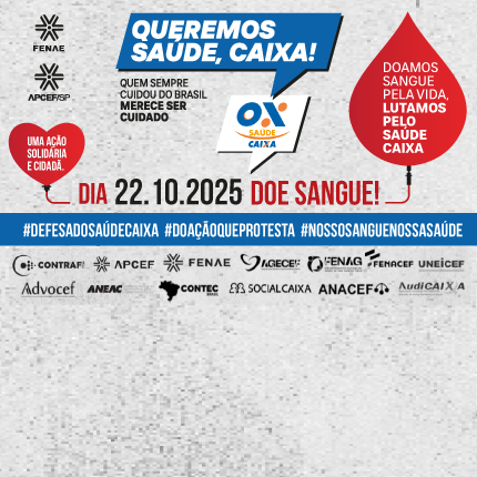 O cuidado com a população brasileira sempre foi uma das marcas da atuação dos empregados da Caixa. Diariamente, milhões de cidadãos são atendidos pelo banco público, seja diretamente ou através dos diversos programas sob responsabilidade trabalhadores da empresa. Por meio de suas entidades representativas, Fenae e Apcefs, a categoria também atua para reduzir as desigualdades sociais do país. Esta solidariedade chega agora à luta em defesa do Saúde Caixa, por meio da ação intitulada “Doamos sangue pela vida, lutamos pelo Saúde Caixa”, que será realizada em 22 de outubro, para incentivar a doação de sangue entre empregados e aposentados.