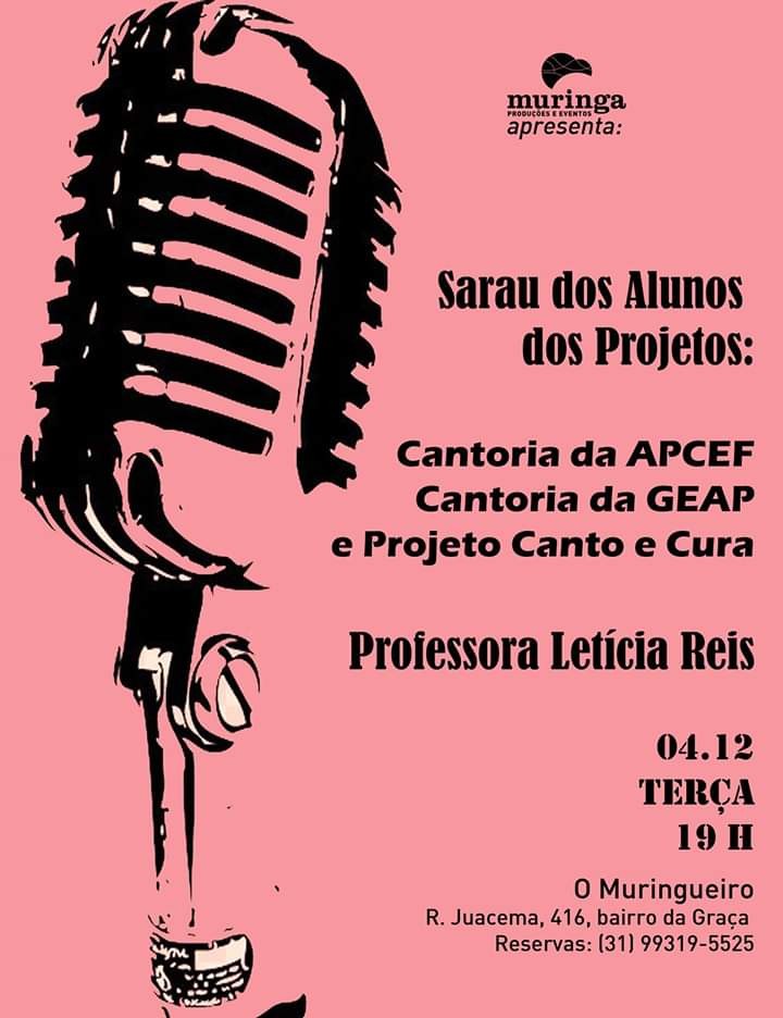 Os alunos do projeto APCEF em Cantoria se apresentam nesta terça-feira, 04 de dezembro, às 19h, no bar o Muringueiro. Será realizado um Sarau com alunos de outros projetos de canto, liderados pela professora Letícia Reis. Prestigie nossos colegas!