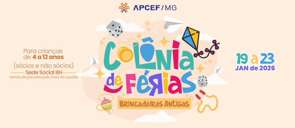 De 19 a 23 de janeiro de 2026, a Sede Social BH da APCEF/MG irá receber as crianças para viver uma aventura inesquecível com o tema Brincadeiras Antigas – uma semana inteira recheada de imaginação, movimento e memórias afetivas que marcaram gerações!