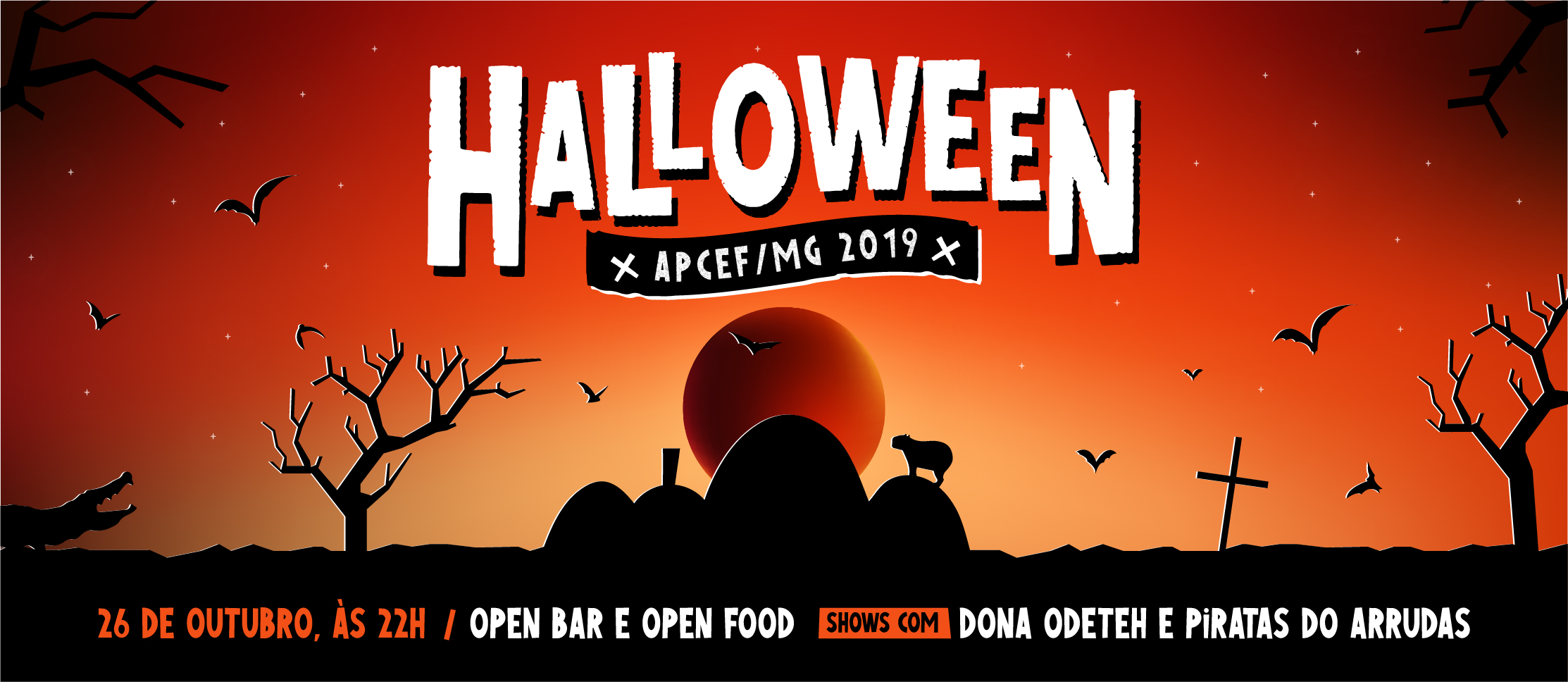 ??? Garanta já pela área do associado o seu ingresso para o Halloween 2019 da APCEF/MG! Vai ser no sábado, dia 26 de outubro de 2019, a partir das 22h, no Salão Diamante da Sede Social BH. O evento será totalmente open bar e open food, com variadas opções. Confira: