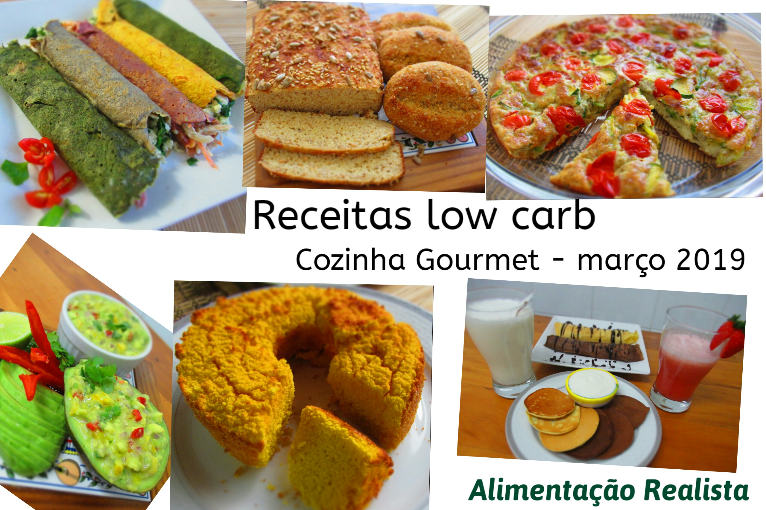 –> Receitas low carb (com baixo teor de carboidratos): farinhas low carb (tipos e como fazer); pão, bolo, panqueca e torta salgada; guacamole e smoothie proteico.