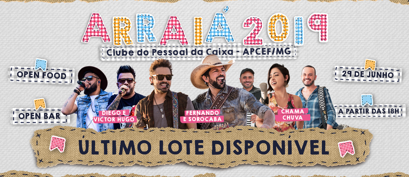 Já está disponível o terceiro e último lote de ingressos para o Arraiá 2019 da APCEF/MG! A festança vai ser realizada no dia 29 de junho, a partir das 18h, nas quadras da Sede Social BH. Evento totalmente open bar e open food, com shows de Fernando e Sorocaba, Diego e Victor Hugo e Chama Chuva.