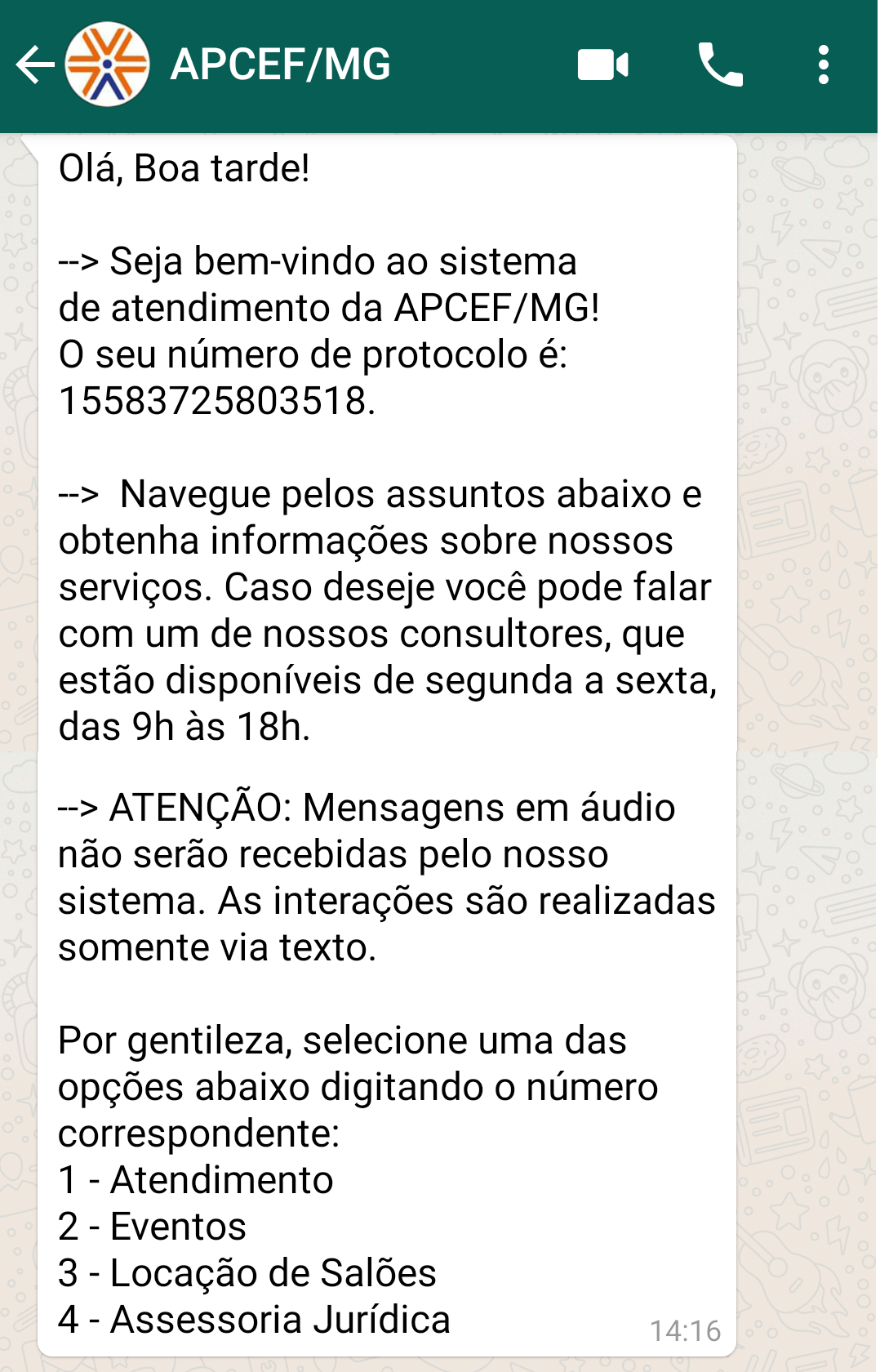 O atendimento pelo Whatsapp foi uma das novidades apresentadas pela APCEF/MG em 2019, buscando melhorar ainda mais a comunicação com os associados. No entanto, temos verificado algumas dúvidas quanto à utilização deste serviço. Um fato comum por se tratar de uma novidade, em um sistema com interação inicial realizada de forma automatizada.