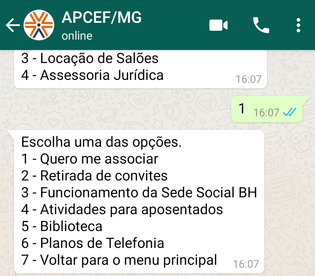 R: Serve para direcionar o assunto do seu interesse. São quatro opções disponíveis neste momento – Atendimento, Eventos, Locação de Salões e Assessoria Jurídica. Digitando o número correspondente, e enviando, você navega por estes assuntos, que se desdobram em outros relacionados, oferecendo informações relevantes sobre os mesmos automaticamente. Estes assuntos podem ser atualizados de acordo com a demanda e o surgimento de novos serviços.