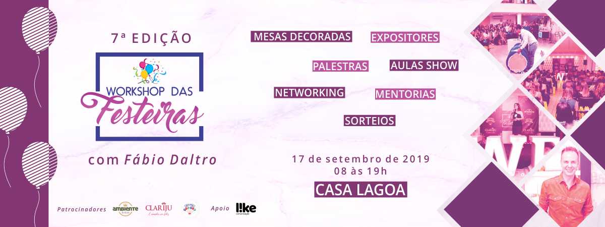 Nesta terça-feira, dia 17 de setembro de 2019, das 10h às 19h, o Espaço de Eventos Casa Lagoa, da Sede Social BH, vai receber a 7ª edição do Workshop das Festeiras. O evento promove o encontro de profissionais do mercado de festas e eventos como decoradores, lojistas, empreendedores, empresários e amantes de festas, com objetivo de levar informações de qualidade para gestão de negócios, impulsionar alianças, parcerias estratégicas e ampliar o networking, além de apresentar as novas tendências do setor e incentivar a especialização e colaboração dos profissionais.