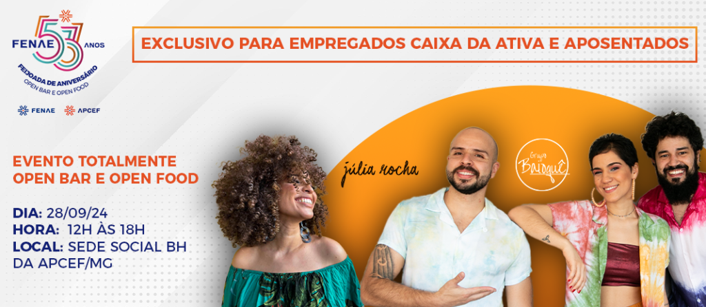 Dia 28 de setembro (sábado), tem feijoada em comemoração aos 53 anos da Fenae (Federação Nacional das Associações do Pessoal da Caixa Econômica Federal). Evento totalmente open bar e open food, somente para os empregados da Caixa e seus convidados.