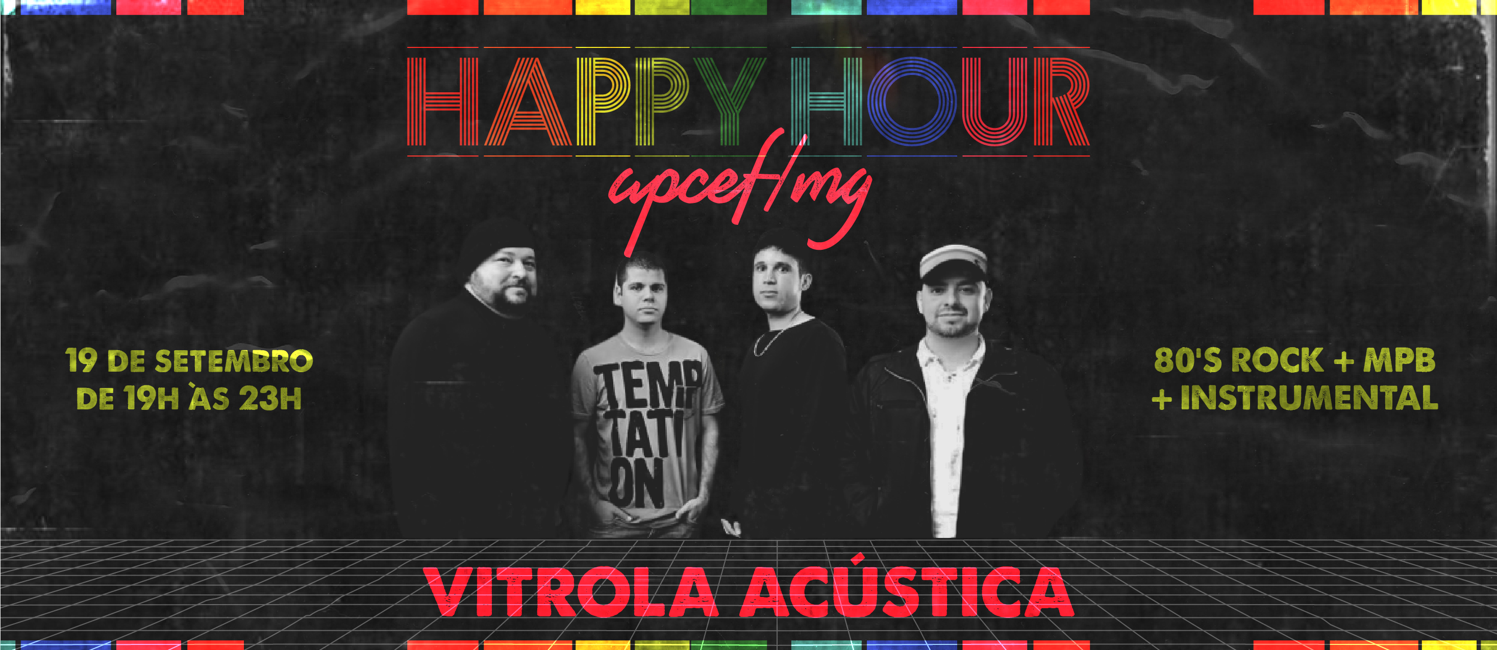 Nesta quinta-feira, dia 19 de setembro, venha curtir mais um Happy Hour na Sede Social BH em clima de nostalgia! A banda Vitrola Acústica será a atração, e vai apresentar vários sucessos do Pop, Rock e MPB dos anos 80 e 90. Vai ser no gramado ao lado do toboágua, das 19h às 23h.
