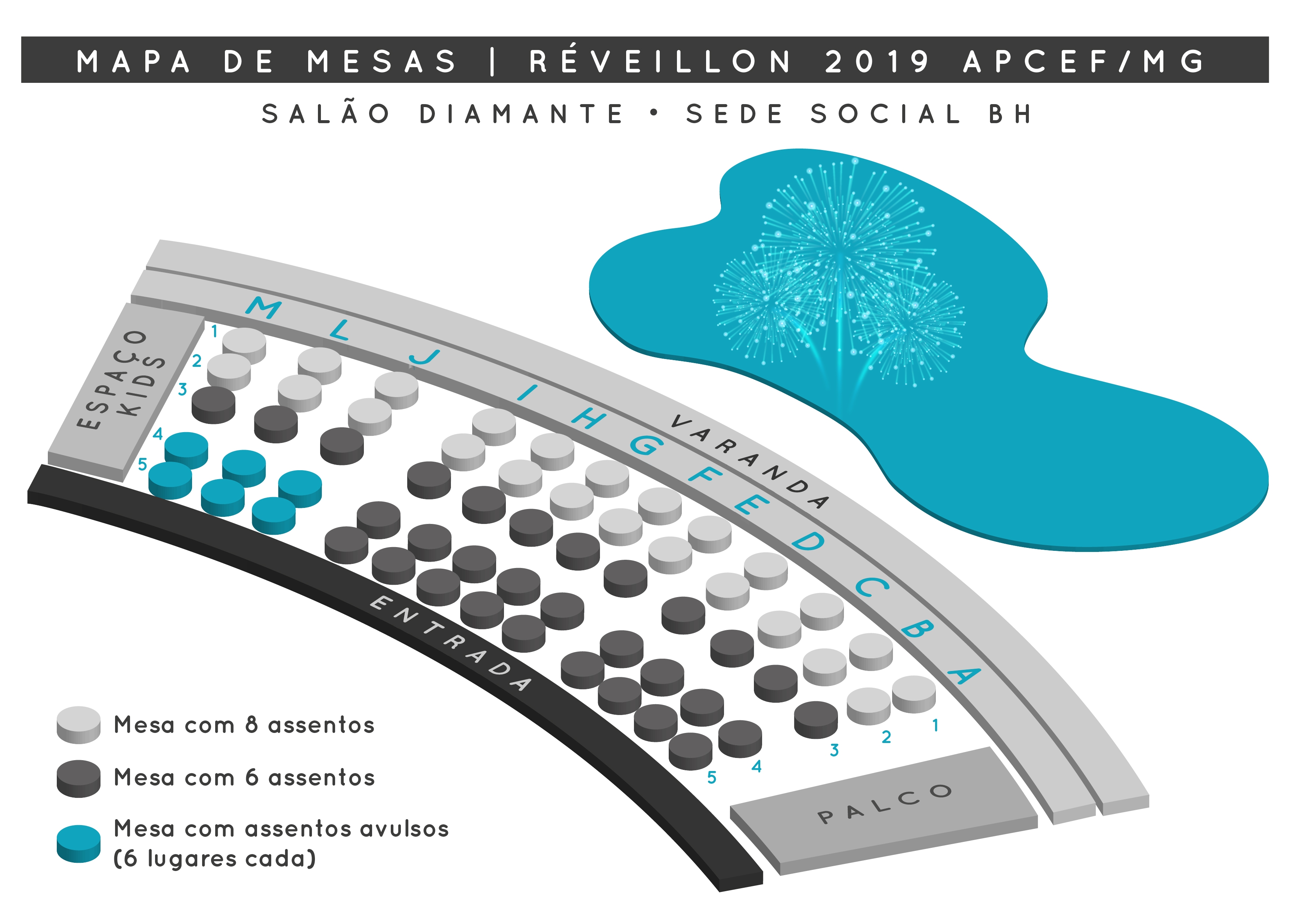 Aproveite a chance para curtir um Réveillon animado e sofisticado no Salão Diamante da Sede Social BH, com open bar e open food do Buffet Santa Lúcia e vista privilegiada para o show de fogos da Pampulha!