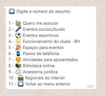 ? Se digitar o NÚMERO 2 você será direcionado para uma lista de assuntos. Para escolher um deles, basta digitar o número correspondente e enviar.