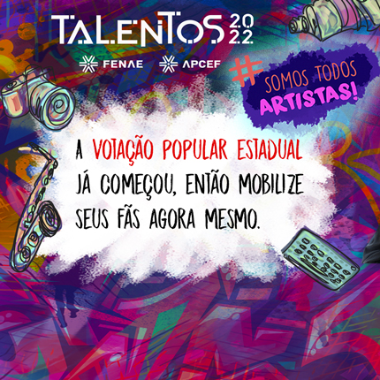 A votação popular do Talentos Fenae/Apcef 2022 já começou. As torcidas já estão se organizando para votar nas obras favoritas entre as categorias e modalidades Foto e Filme (foto/vídeo), Artes Visuais (desenho e pintura/desenho infantil), Literatura (contos e crônicas/poesia) e Música (composição e interpretação). O prazo final de votação popular da etapa estadual termina em 16 de outubro.