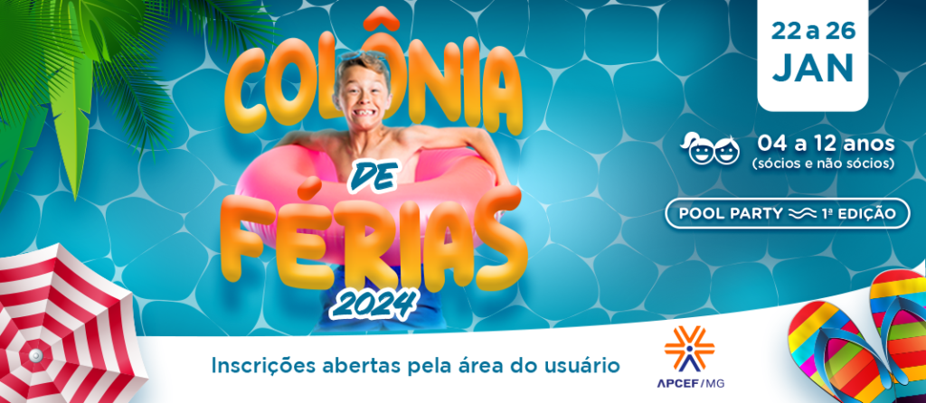 Se você ainda não garantiu seus pacotes para a Colônia de Férias 2024 da APCEF/MG, corre que o 1º lote acaba às 23h59 desta sexta, 12 de janeiro. A partir deste sábado, os preços serão reajtustados! O evento vai ser realizado de 22 a 26 de janeiro, na Sede Social BH. Podem participar crianças de 04 a 12 anos (sócios ou não sócios), e os pacotes devem ser adquiridos exclusivamente pela área do usuário.
