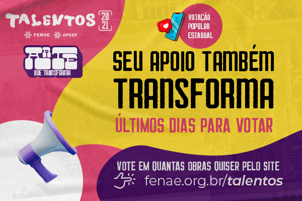 Termina neste sábado, 31, a votação popular estadual do Talentos Fenae/Apcefs 2021. Para votar é fácil, basta acessar a plataforma online www.fenae.org.br/talentos, conferir as obras inscritas nas diversas categorias, escolher sua favorita e votar, usando o login do Mundo Caixa ou do Facebook. Se você é participante, é hora de convidar os amigos, colegas de trabalho e a família para votar em sua obra.