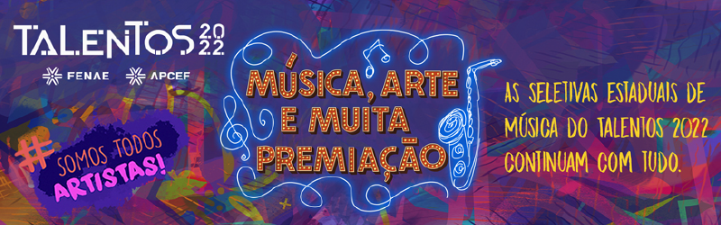 🎨 Há como estávamos com saudades de nos reunir para celebrar mais um evento sociocultural realizado com sucesso pela Fenae e Apcefs de todo o Brasil. Após 2 anos sem a premiação presencial na etapa estadual, o Talentos Fenae 2022 terá novamente a seletiva na categoria Música e também vamos conhecer os três primeiros colocados, já definindos nas modalidades: Foto & Filme, Artes Visuais e Literatura.