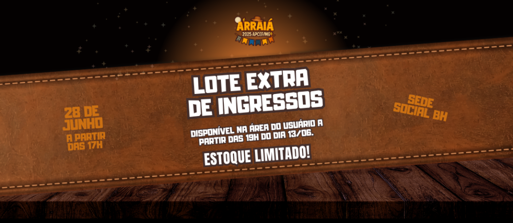 Ei sócio, você que não conseguiu comprar os seus ingressos para o nosso Arraiá 2025, temos uma boa notícia. Amanhã, dia 13 de junho, será aberto pela área do usuário um lote extra com poucas unidades de ingressos para o evento que acontece no próximo dia 28/06. Não perca essa oportunidade de garantir o seu lugar nessa linda festa da APCEF/MG.