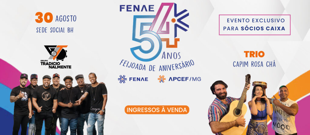 Alô sócio empregado Caixa da ativa ou aposentado: não fique de fora da comemoração ao aniversário da Fenae: venha curtir uma deliciosa feijoada e chopp gelado para brindarmos os 54 anos de história da nossa querida Federação na Sede Social BH!
