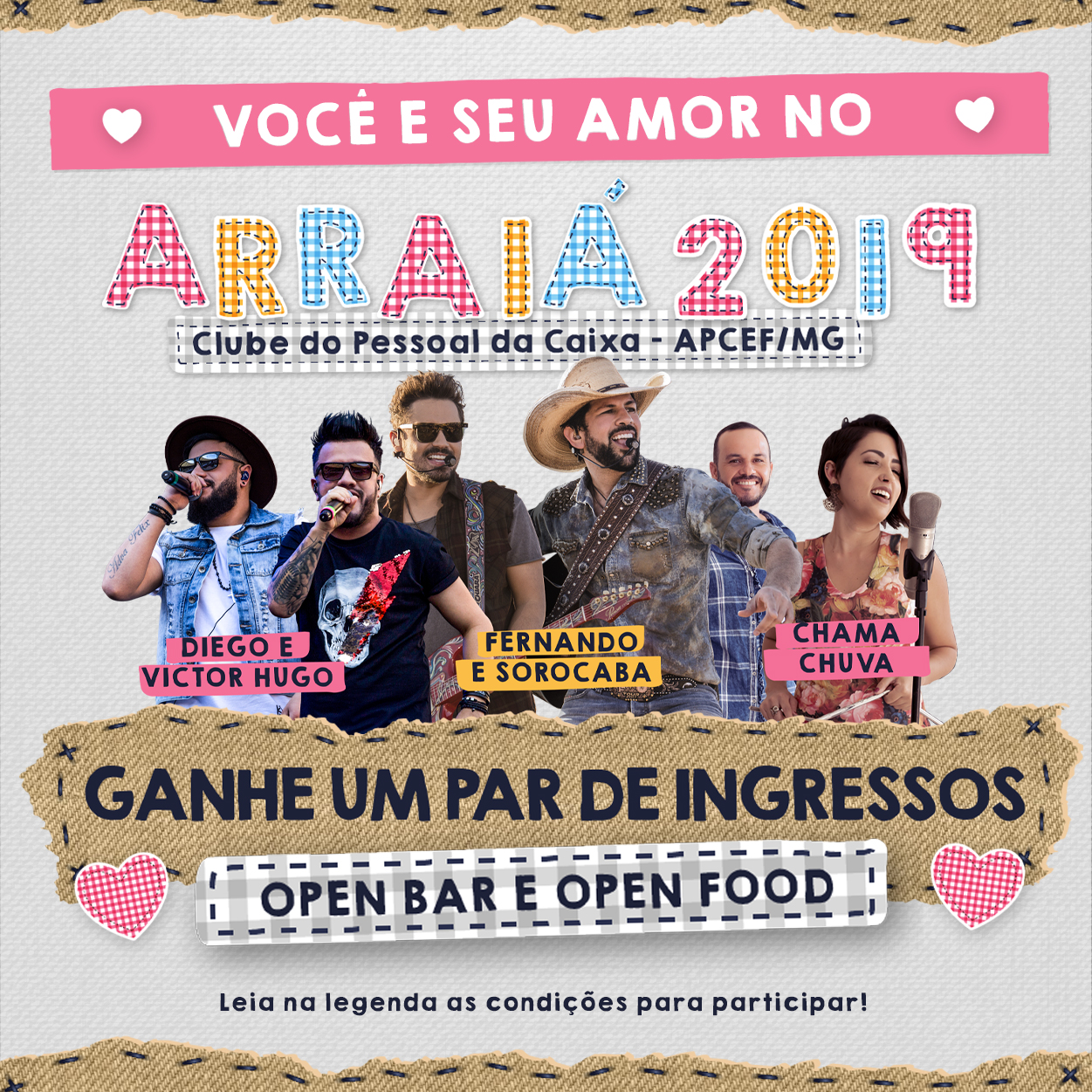 Quer um par de ingressos na faixa para curtir o Arraiá 2019 da APCEF/MG juntinho com seu amor? Então não perca tempo e participe da promoção Você e seu amor no Arraiá 2019! É muito simples: basta seguir os passos abaixo, usar a criatividade, avisar os amigos e torcer bastante: