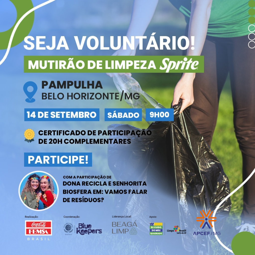 🚮 Traga sua família e ensine seus filhos bons hábitos de sustentabilidade. Inscreva-se aqui, participe e ainda concorra a sorteio de brindes durante o evento promovido pela Femza Brasil, Beagá Limpa e Blue Keepers em parceria com a APCEF/MG.